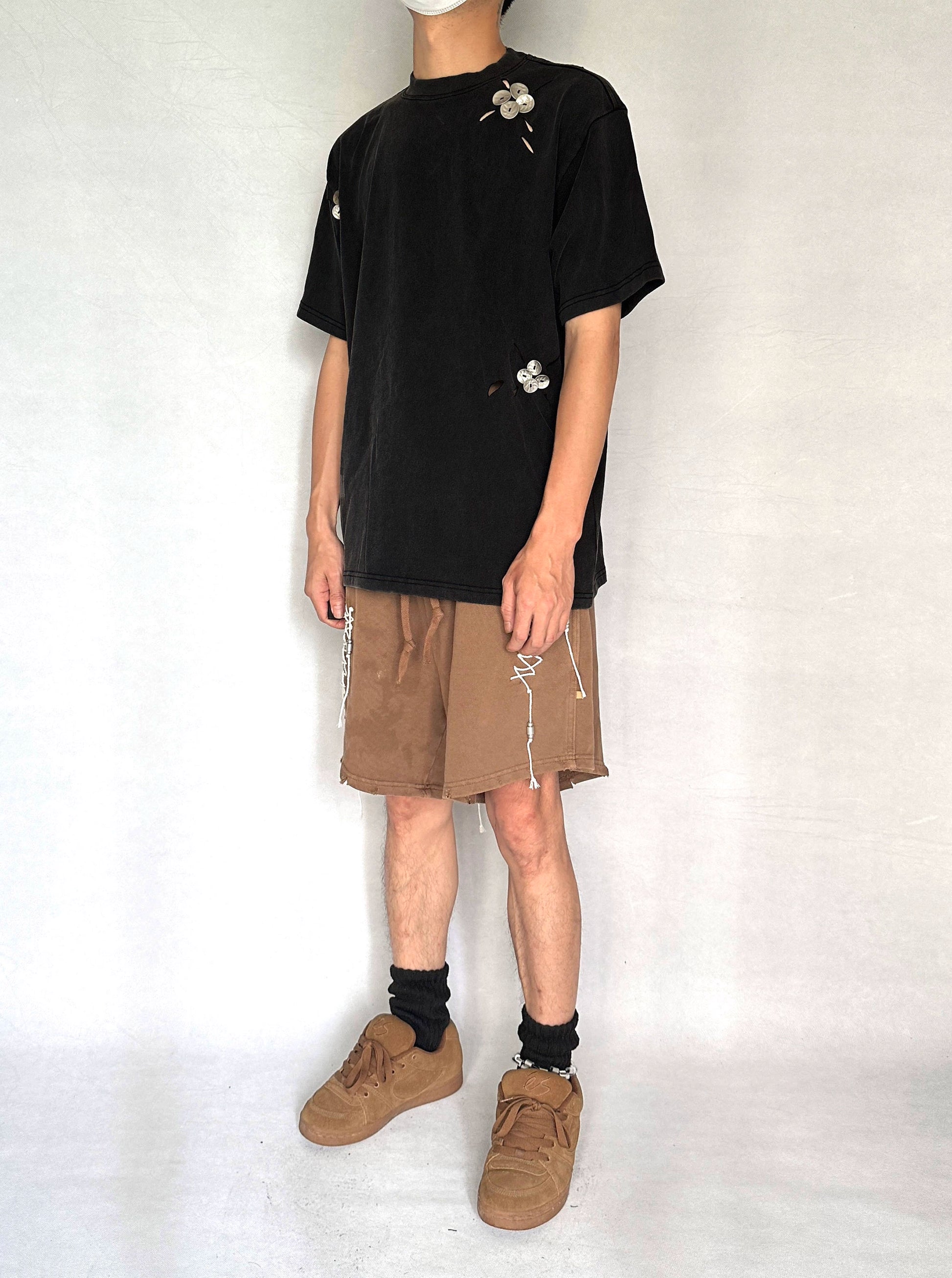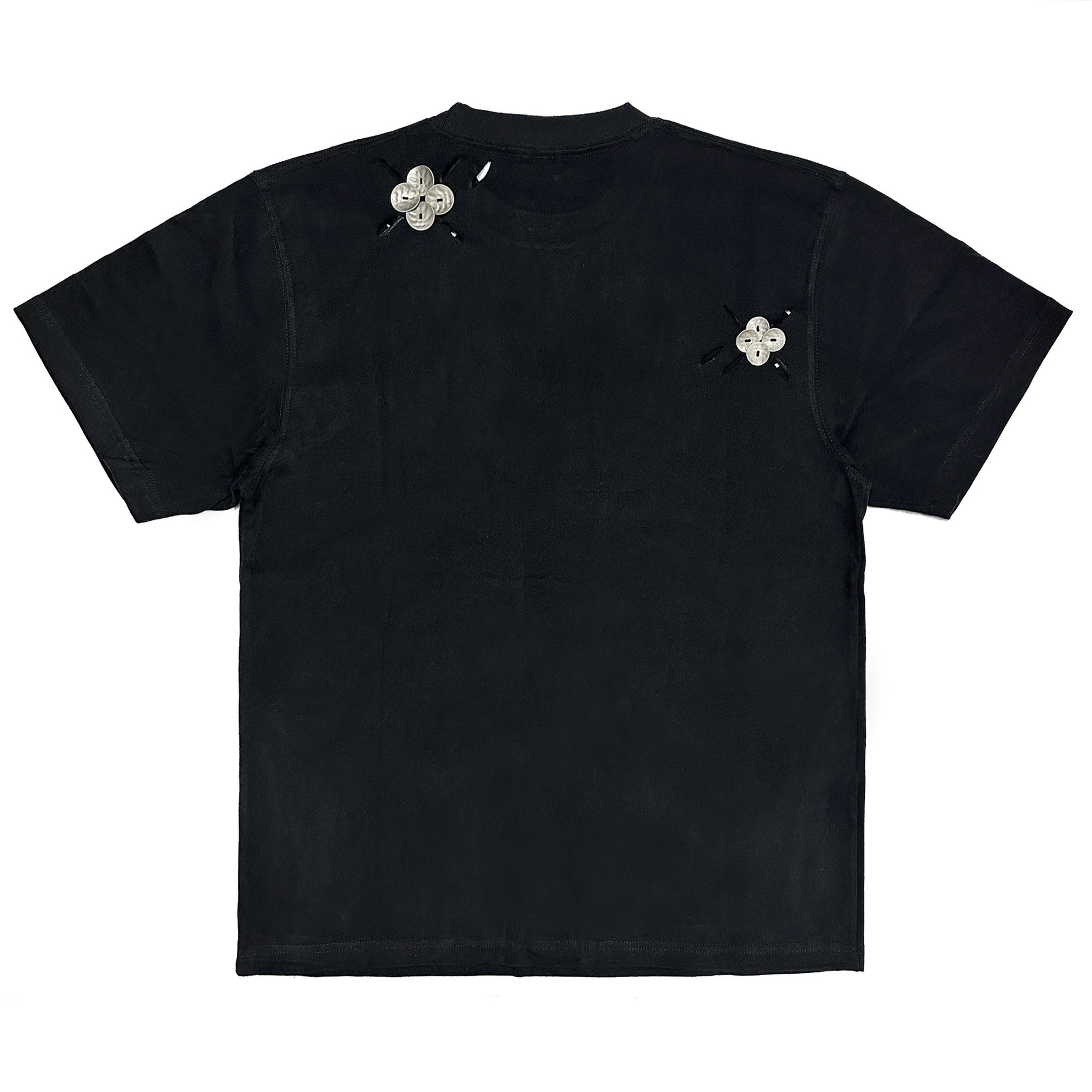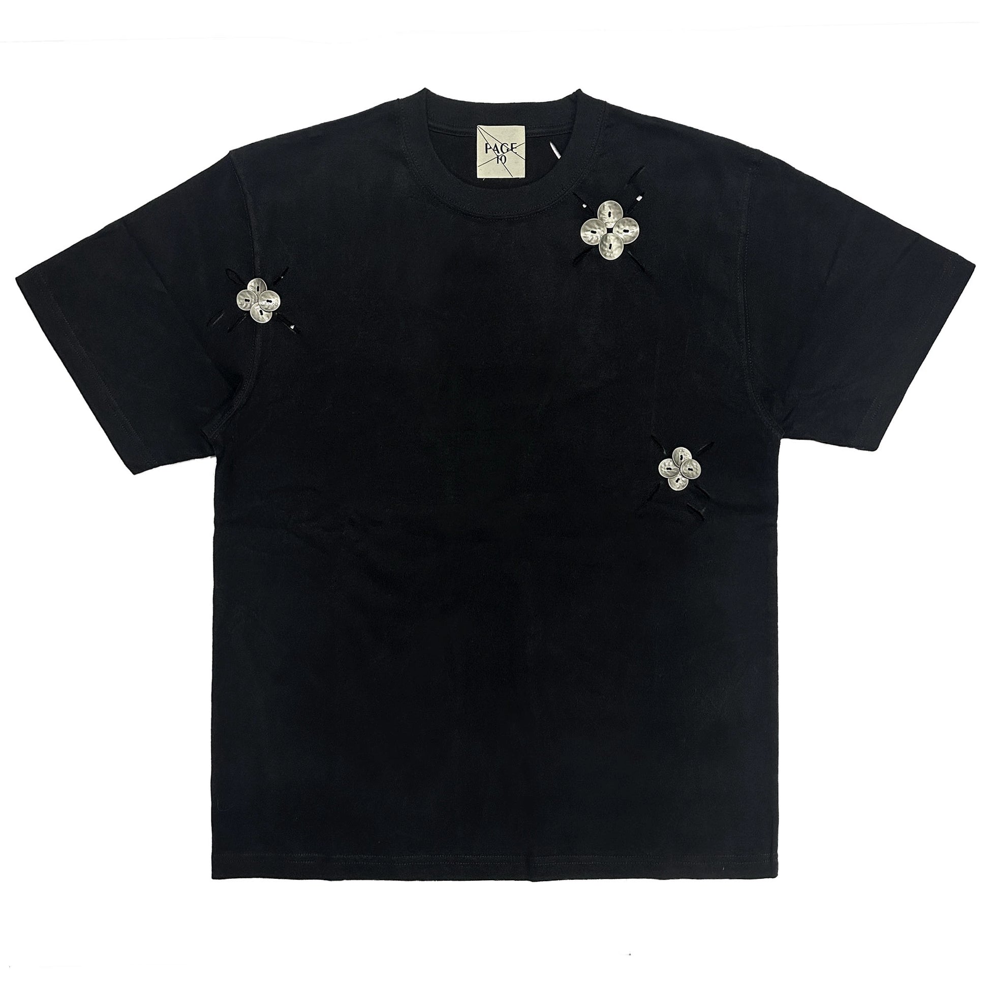 The SS25 UNTOLD AND PAGE Handmade Split Leaf Metallic Petals #1 is a striking piece featuring meticulously handcrafted metallic petal embellishments arranged in a unique split leaf pattern. This top blends artisanal craftsmanship with a futuristic edge, creating a bold fashion statement perfect for special occasions or standout streetwear looks.