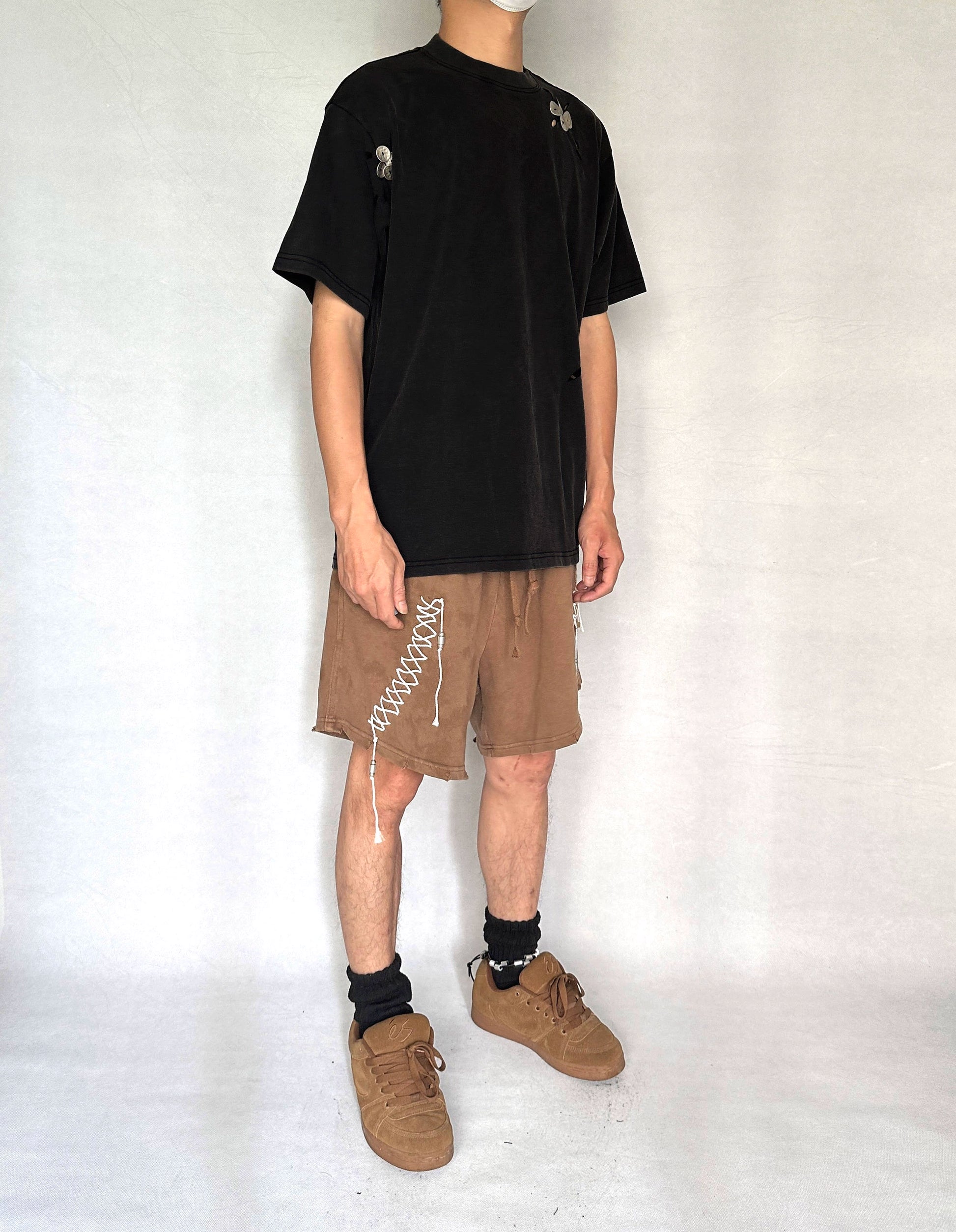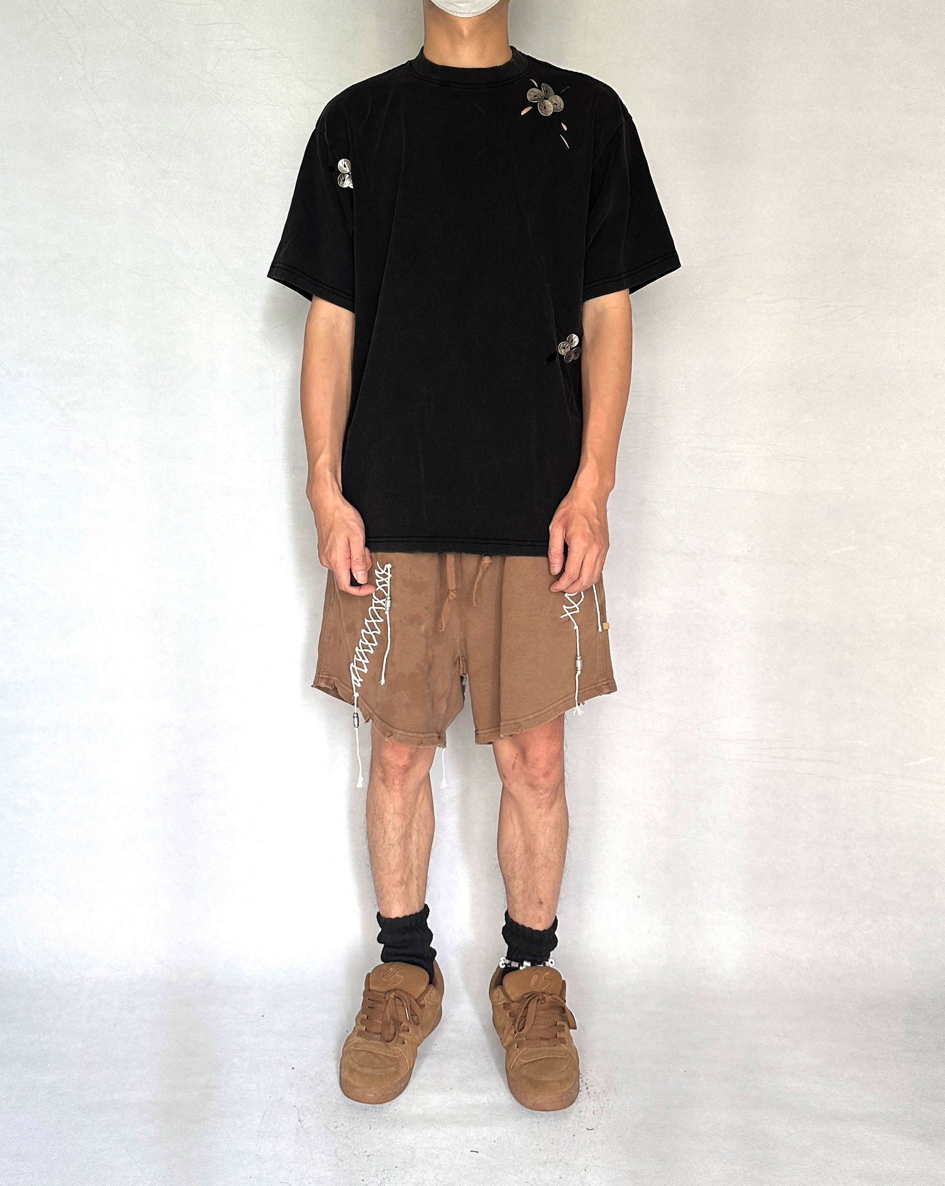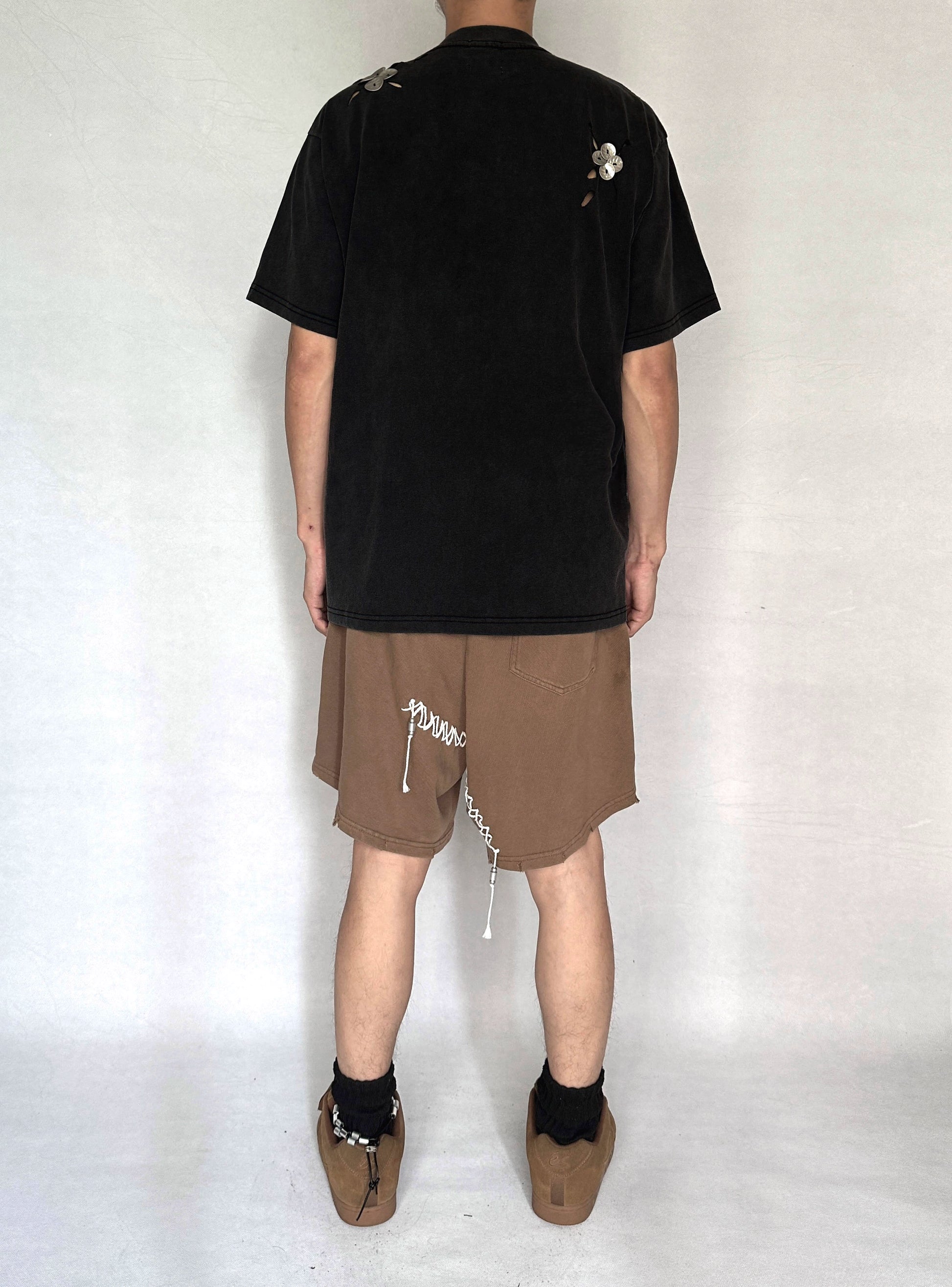 The SS25 UNTOLD AND PAGE Handmade Split Leaf Metallic Petals #1 is a striking piece featuring meticulously handcrafted metallic petal embellishments arranged in a unique split leaf pattern. This top blends artisanal craftsmanship with a futuristic edge, creating a bold fashion statement perfect for special occasions or standout streetwear looks.